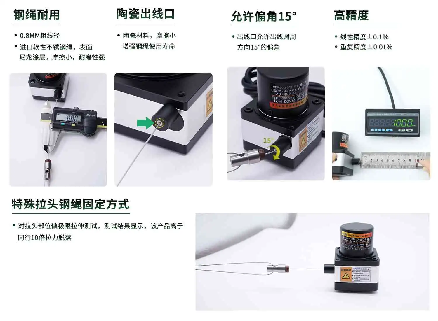 将钢丝绳从拉线式拉绳位移传感器中缓慢拉出,直到达到所需的测量长度。在拉出过程中,要尽量保持钢丝绳和出绳口不摩擦,且钢丝绳的拉出方向应与拉线式拉绳位移传感器的侧面平行。布瑞特拉线式拉绳位移传感器最高可达15度偏角安装,且采用0.8mm粗线径进口软性不钢绳,表面尼龙涂层,摩擦小,耐磨性强。使用特殊拉头固定方式,拉伸极限力,高于同行10倍。出绳口陶瓷材质,耐磨材料可增长钢绳寿命。